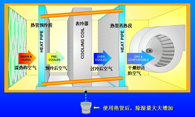 夏季空气处理流程为:新风进---初效过滤---三维热管预冷降温---表冷器降温除湿---三维热管再热升温---风机---中、高效过滤---送风。