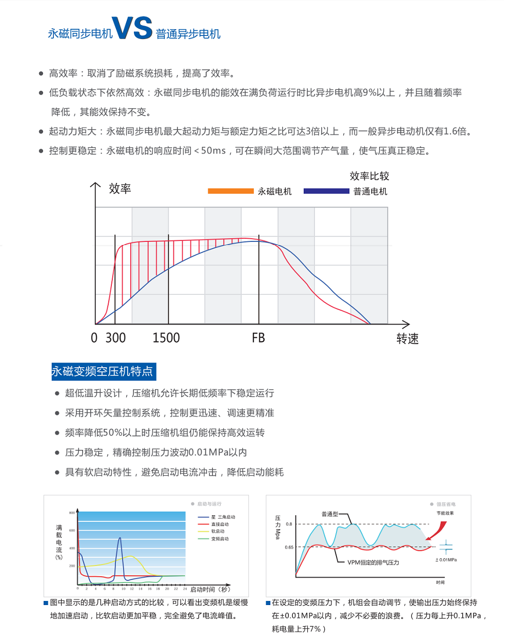 采用两级压缩:确保主机泄露更少,容积率更高,同等功率下产气量提升15%。配合永磁电机使用:电机效率96%,功率因数0.99,远超一级能效