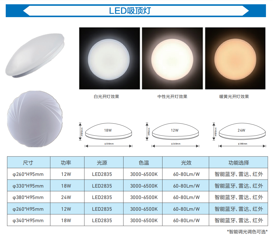 LED吸顶灯适用:宿舍、商场,银行,医院,宾馆,饭店及其他各种公共场所长时间照明
