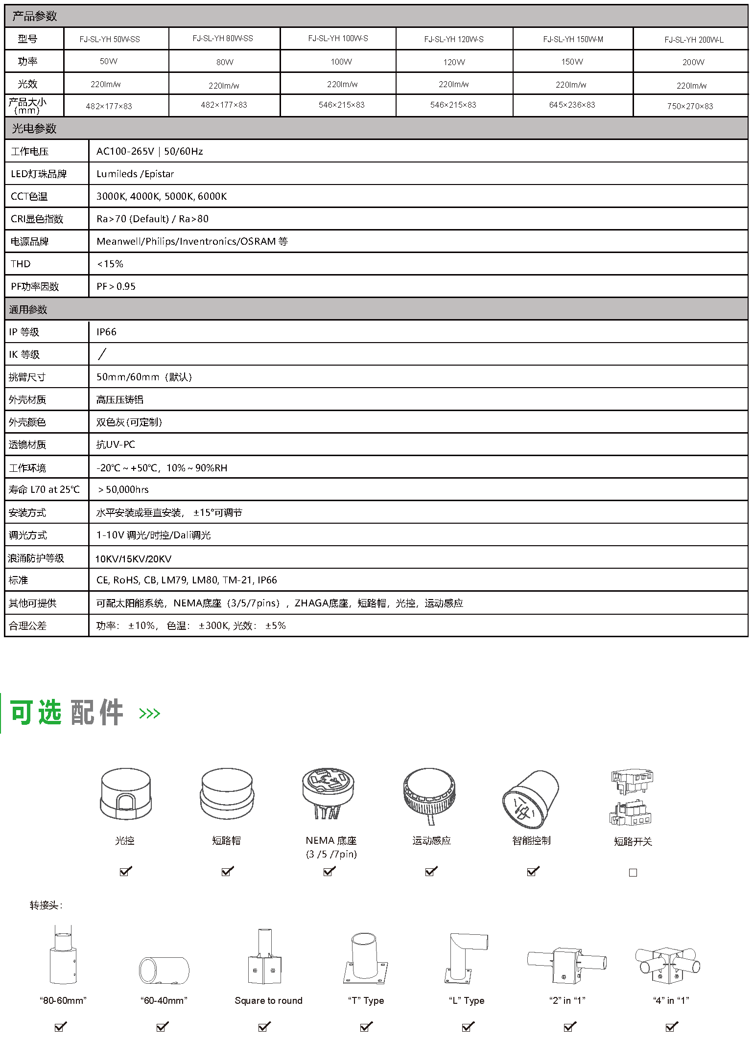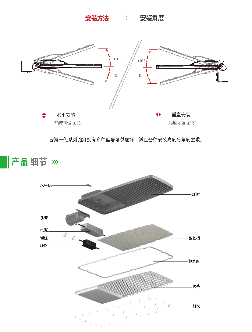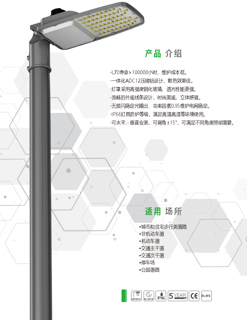 LED路灯是厂区道路照明的主要设施,我司路灯采用一体化压铸铝的方式,散热效果优异,且安装方便。电源与散热部分独立设计,无工具的情况下都可以直接打开电源仓,维护方便。专利灯头设计可以调节角度±15°,光效高,功率因数>0.95。使用寿命超长,质保期5年。