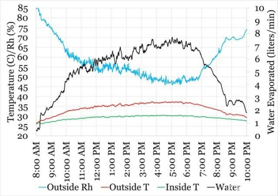 蓝:室外环境相对湿度 红:室外环境温度 绿:蒸发降温后送风温度 黑:蒸发量(水)